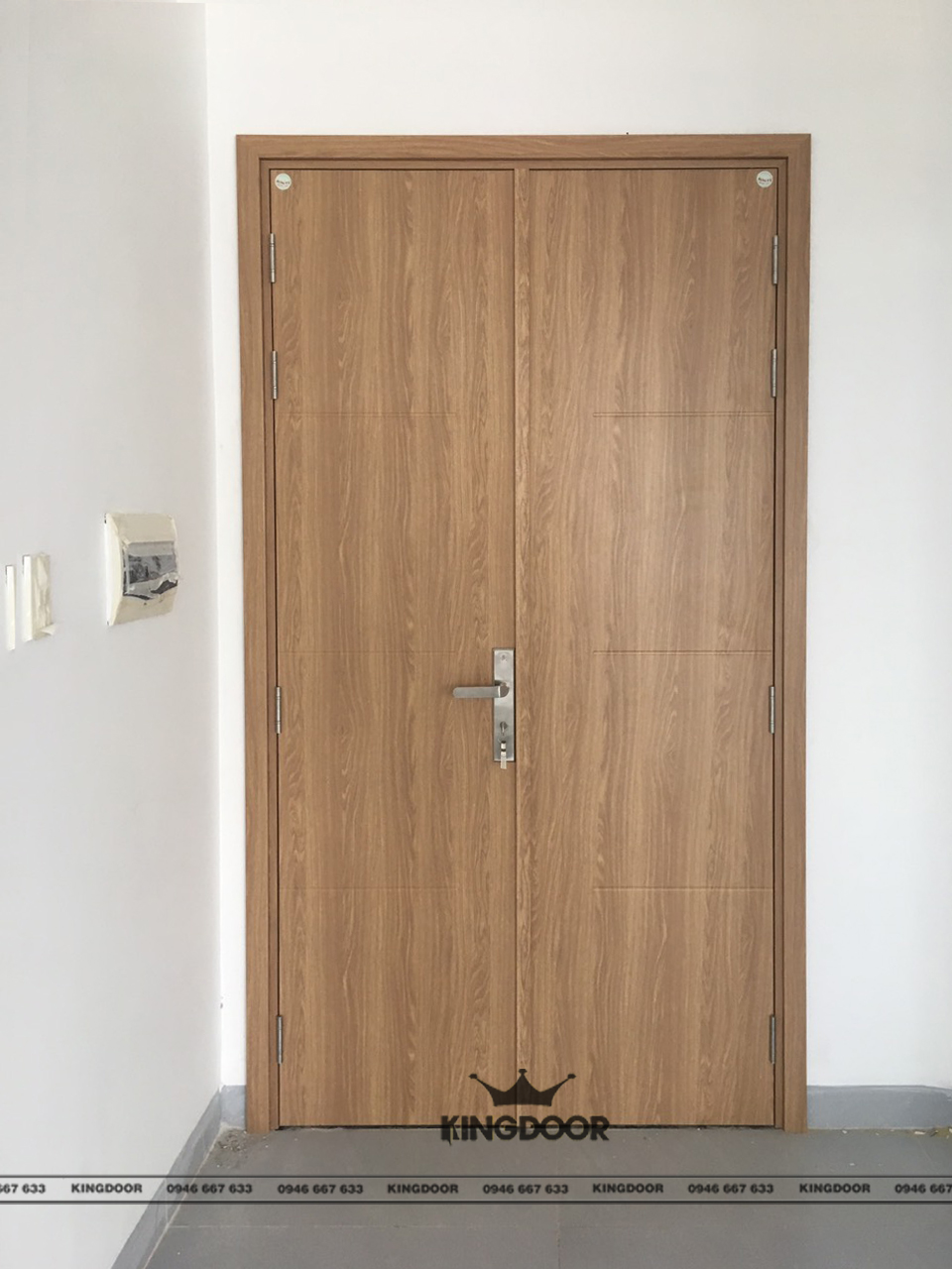 Kích thước 1.970 x 2.200 (mm): Giá 6.800.000 vnđ/bộ. Gồm: Cánh, khung bao, chốt âm, nẹp che khe giữa 2 cánh.